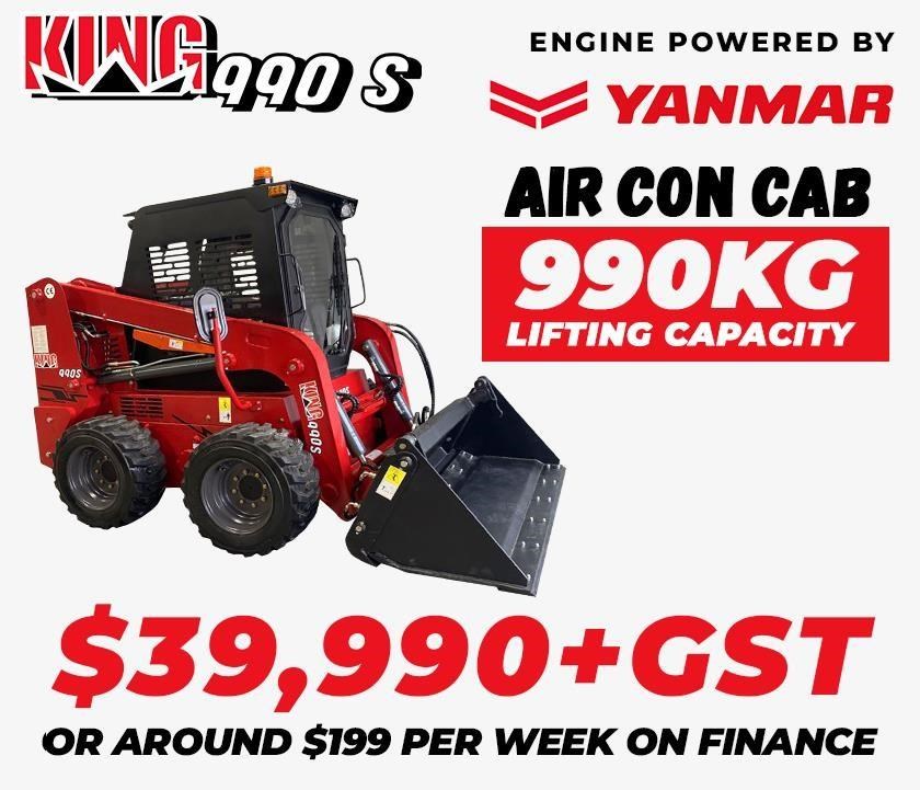 Digger King 990 Skid Steer Loader - 1730mm Wide With Enclosed Cab, Air Conditioning, Joystick Controls and More Lifting Capacity At only $39,990 + GST or around $199* per week, scroll down for all inclusions Want to make more money in your business faster, easier and more efficiently? Want a machine big enough to be fast and efficient but small enough to fit in tight spaces? Looking for high quality machine and a fair price? Answer yes to any of the above? Well maybe the King 990 skid steer loader is just right for you, priced affordably, the jobs this machine can be used for is endless. Not to mention the King 990 Skid Steer is an eye catching profit making beast! Watch how many people want to look at it and be amazed at how professional your business will look using the latest technology. It includes all of our standard features, plus everything you need to get started with your 990 S Loader with 4 in 1 bucket Load Capacity - 990 kg Yanmar Engine Max Load - 1660 kg Weight (with bucket) - 3010 kg Dimensions (without bucket) - 2520 mm (L) x 1730 mm (W) x 2070 mm (H) Warranty - 12 month parts and labour, 36 month parts warranty 4 in 1 Bucket - this allows your King 990 S to doze, dig, dump, carry, clamp, grab, optional teeth Fully Enclosed Cab with Reverse Cycle Air Con - whether it's summer or winter, you will be working in complete comfort with the 990 S Electronic Hydraulic Joystick Control - for easier operation Bucket and Arm Safety Lock - keep safe whilst you're working with our additional safety features Parking Brake - another safety feature that comes as standard with all Digger King skid steer models Lighting Package - includes warning light, front and rear turning light, rear width light Reverse Buzzer - alerts other workers and allows them to move out of the way whilst you're reversing Key Stop Engine - for the security of your machine when left on site Large Alloy Radiator with Cooling Fan - efficient cooling of engine and hydraulic oil Joystick Steering Control - manual controls means it's easy to use and manage your King 990 skid steer Hydraulic Oil Cooler - this means it keeps oil temp lower allowing you to operate longer with no issues Triple Hydraulic Pump System - this means you have efficient separation of power to attachments, bucket controls, and wheels with your King 990 skid steer Auxiliary Hydraulic Outputs - this means you can add many options of external accessories to your King 990 skid steer Hose Quick Coupler Fittings - this means it eliminates the chance of dirt and other foreign objects getting into your King 990 skid steer Curved Lift Arms to Facilitate a Radial Lift Pattern - allows your King 990 skid steer attachments to lift 'up' and 'out' increasing clearance to the front of the machine. Handy when using large augers CNC Manufacturing and Electrophoresis Paint Process - this gives you the unique King rust protection and excellent finish Large Donaldson Air Cleaner Primary/Secondary with Dust Venturi - you get longer working hours between services of your King 990 skid steer Muffler Insulation - this allows the engine to operate cooler allowing you to operate longer with your King 990 skid steer Hydrostatic Drive Train System - this allows you to do jobs with your King 990 skid steer easily as the hydraulic power is doing the work for you Japanese NSK Bearings and Grade 60H Chains - your King 990 skid steer is a just like Toyota designed to be unbreakable Standard Attachment Mounting Plate - you can buy attachments anywhere you like for your King 990 skid steer or use ones you may have already Operator Platform Suspension - when you are working on your King 990 skid steer your comfort is number 1 allowing you to work longer and easier day in, day out Gauges and Warning Lights - these gauges point out if there are any issues, meaning you can stop the machine and rectify before any damage is caused allowing your King 990 skid steer machine a long and reliable service life. Service Kit and Tools - included free is a tool box and service kit so you wont have to go digging for tools if you need to service or adjust something on your King 990 skid steer Hose Protection Kevlar Sleeving - prevents burst in the hoses, once again extending the life of your King 990 skid steer Track Drive with Grease Tensioner and Heavy Duty Re-coil Spring - this King 990 skid steer design gives you better traction and a lighter footprint meaning you can go anywhere with almost no trace Engine Access Panel Hinged and Lockable - this gives you easy access to all your components of your King 990 skid steer Heat-Treated Pins and Greaseable Bronze Bushes - this gives you longer life for your King 990 skid steer Tie Down Locations - safe security for transporting for your King 990 skid steer Emergency Stop Switch - quick and easy to hit in case of any issues while operating the machine; all standard on the King 990 skid steer Lift Hook Locations - if you have to lift your machine on to a site via a crane etc it can be done easily without any risk to your King 990 skid steer Lift Arm Safety Support - this means you are safe when using your King 990 skid steer Engine Engine Make Yanmar Cylinder 4 Rated Power 62 hp Rated Speed 2500 RPM Rated Flow 80 l/min Controls Electronic Hydraulic Joystick Control Fuel Diesel Electrical 12V Hydraulic System Pump Brand Danfoss (Denmark) Motor brand Sauer (USA) Flow 79 L/Min Valve Brand SD Pressure 180 Bar Cooler Water Driving System Motor Brand Poclain Pressure 180 Bar Flow 80 L/Min Speed 12 Km/h Aux Circuit Pressure 180 Bar Flow 79 L/Min Valve Brand SD Fluid Capacities Fuel 80L Diesel Hydraulic Oil 79L Engine Oil 6.5 L Tyres Type Tubeless Size 10-16.5 Specifications Rated Load - 990 kg Weight - 3010 kg Width - 1730mm (including bucket) Dimensions - (without bucket) - 2520mm (L) x 1730mm (W) x 2070mm (H) 4 in 1 Bucket - 1630mm wide Bucket capacity - 0.47 m3 Cabin - Enclosed with reverse cycle air conditioning Warranty - 12 month parts and labour, 36 mo