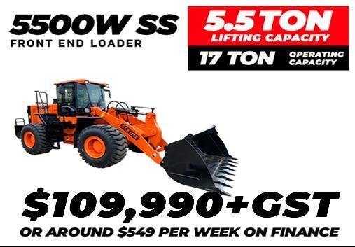 5500W Super Strong Godzilla Loader - 17 Ton Operating Weight, 5.5 Ton Lifting Capacity, 215 HP Cummins Engine From just $109,990+GST or around $549 per week on finance, you can get started with the Massive 5500W SS today SUPER heavy duty, economical and reliable. The 5500W SS could be exactly what you're looking for. Do you have a property you need to take care of? Or need to pick up items up to 5.5 ton with a set of forks? Maybe you have a farm or need to do extra work at the weekends around your property or your business? The 5500w SS is a proven and reliable choice for your farm or business. Easy to maintain, 5.5 ton lifting capacity and huge 215 hp. At just $109,990+GST or around $549 per week on finance, it's a cost effective solution for working on your property or farm. If you're interested in looking at the features of the 5500W SS, watch the detailed video tour of the machine below. Massive 5500W SS 17 ton loader, with 6 cylinder 215 hp engine. Operating Weight - 17000kg / 17 ton Load Capacity - 5500 kg / 5.5 ton Engine - 6 cylinder, 215 HP Dimensions - 7720 (L) x 3030 (W) x 3378mm (H) (+130mm alarm lamp) Includes - GP bucket with 4.5m3 capacity, heavy duty forks, hydraulic quick hitch Air Conditioned Cab - for the summer, heated for the winter Warranty - 24 months manufacturer's warranty Delivery - Australia wide delivery available Easy to apply, no deposit and financing available- The Godzilla Loaders 5500W SS from just $549 per week, all done via experienced finance teams that search for the best deal for you. From the first day you own your new loader, no dodgy overpriced rent-to-own options Bucket and Arm Safety Lock - keep safe whilst you're working with our additional safety features Parking Brake - another safety feature that comes as standard with all Godzilla Loader models Lighting Package - includes warning light, front and rear turning light, rear width light Reverse Buzzer - alerts other workers and allows them to move out of the way whilst you're reversing Key Stop Engine - for the security of your machine when left on site Large Alloy Radiator with Cooling Fan - efficient cooling of engine and hydraulic oil Hydraulic Oil Cooler - this means it keeps oil temp lower allowing you to operate longer with no issues Auxiliary Hydraulic Outputs - this means you can add many options of external accessories to your Godzilla Loaders 5500W SS loader Hose Coupler Fittings - this means it eliminates the chance of dirt and other foreign objects getting into your Godzilla Loaders 5500W SS loader Quick Release Attachment Mounting Plate - you can buy attachments anywhere you like for your Godzilla Loaders 5500W SS loader or use ones you may have already Gauges and Warning Lights - these gauges point out if there are any issues, meaning you can stop the machine and rectify before any damage is caused allowing your Godzilla Loaders 5500W SS loader machine a long and reliable service life. Service Kit and Tools - included free is a tool box and service kit so you wont have to go digging for tools if you need to service or adjust something on your Godzilla Loaders 5500W SS loader Engine Access Panel Hinged - this gives you easy access to all your components of your Godzilla Loaders 5500W SS loader Tie Down Locations - safe security for transporting for your Godzilla Loaders 5500W SS loader Emergency Stop Switch - quick and easy to hit in case of any issues while operating the machine; all standard on the Godzilla Loaders 5500W SS loader Lift Hook Locations - if you have to lift your machine on to a site via a crane etc it can be done easily without any risk to your Godzilla Loaders 5500W SS loader Lift Arm Safety Support - this means you are safe when using your Godzilla Loaders 5500W SS loader