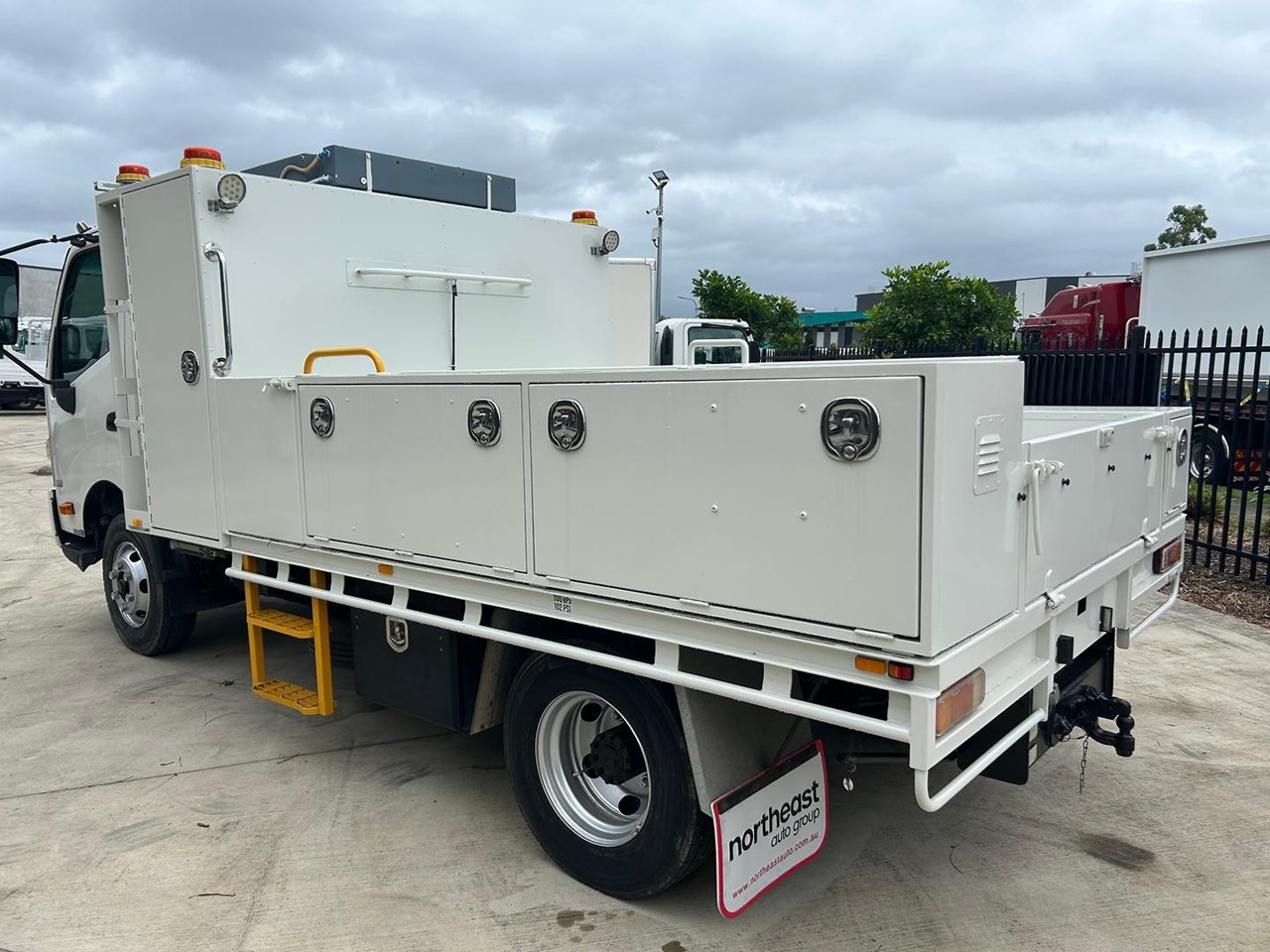 Fitted with steel service body with 5 storage tool boxes, reverse camera, 3500kg rated tow bar and canvas seat covers.
