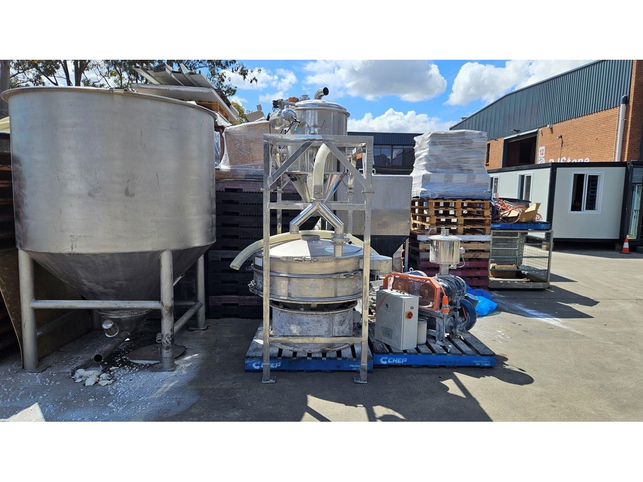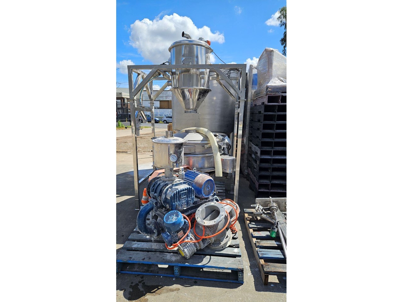 Complete Vacuum Transfer System for Powders Efficient and reliable powder handling system with a transfer capacity of approximately 2 tonnes per hour. System includes: Stainless Steel 4000L Silo - robust storage for bulk powder materials St/Steel Vacuum Transfer Head - equipped with integrated filters(reverse pulse) and timer controls for precise operation Rotary Valve - positioned below the header vessel for consistent material flow 5.5 kW Roots Blower - generates the vacuum required for efficient powder conveyance Vibrating Sieve - screens the powder discharged from the rotary valve and header vessel, ensuring uniform particle size Performance: Capable of transferring material horizontally up to 3 meters and vertically up to 5 meters. Located in Sydney NSW.