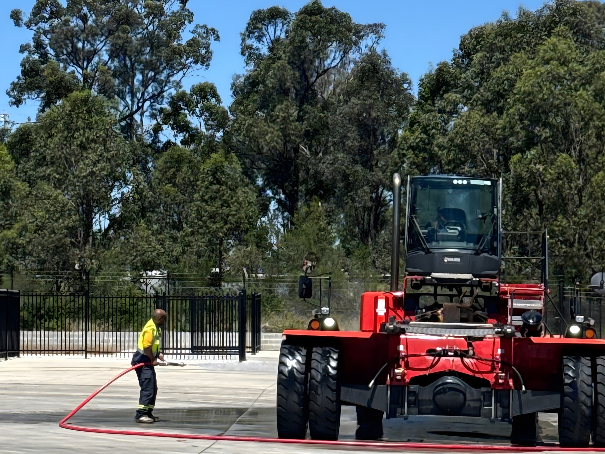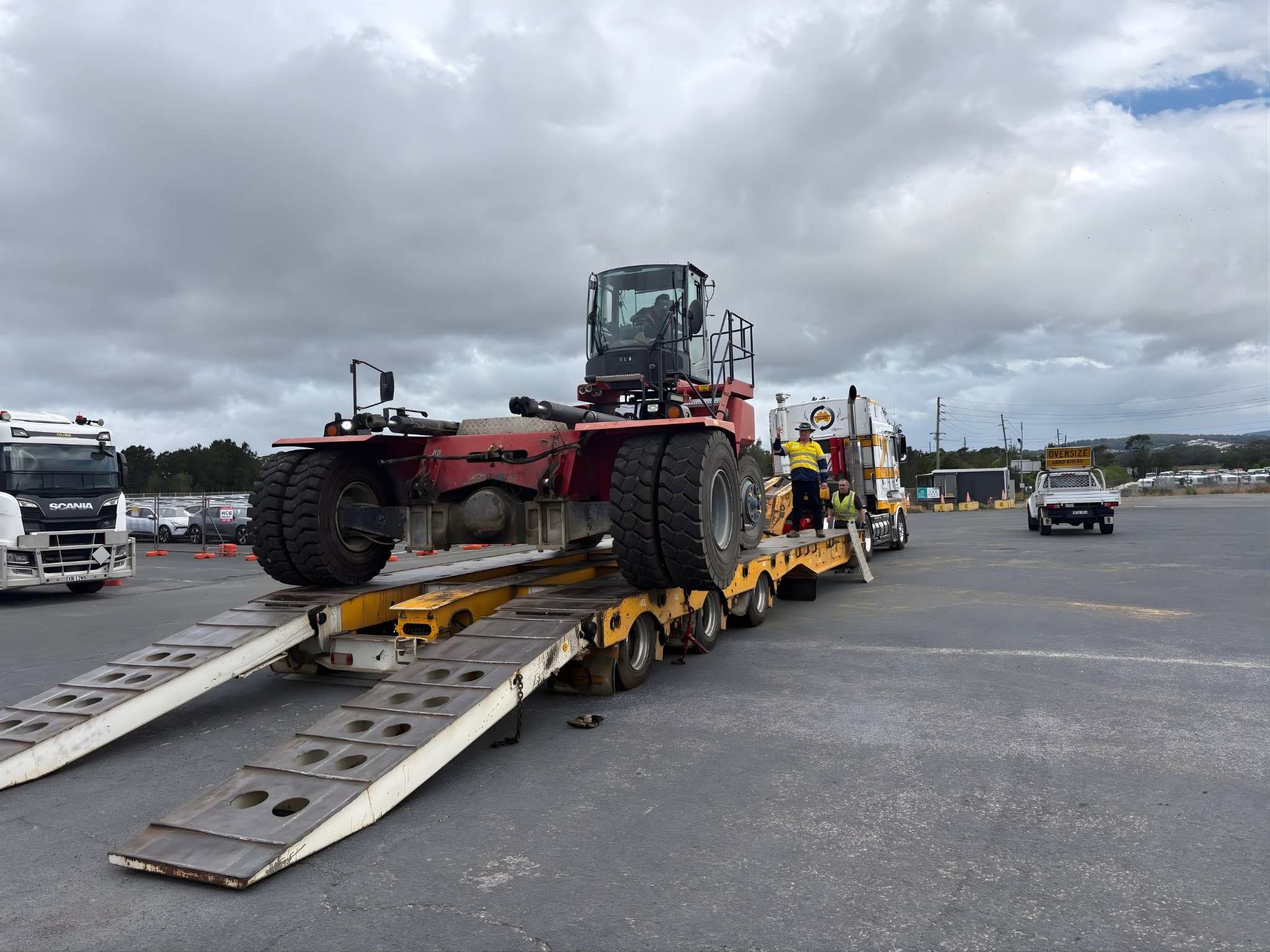 > Export wash: The drivable main units were transported to a wash facility and cleaned to meet strict RORO vessel biosecurity standards.